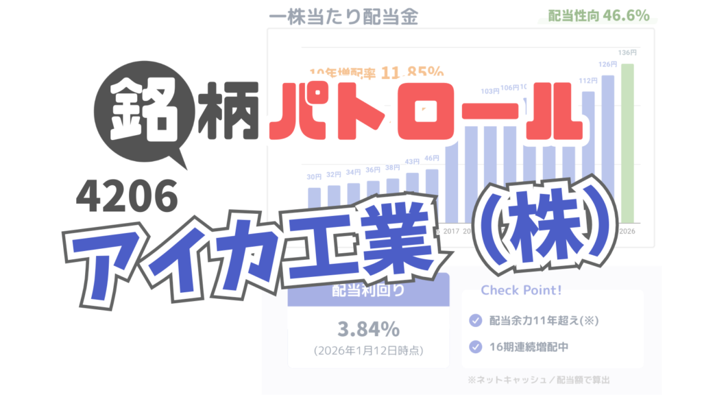 27期連続減配なし!化学メーカー「アイカ工業(4206)」の紹介。 財務優良で、「実質現金」をたっぷり持っている企業! 【概略】 ・配当利回り:3.84% ・配当余力:驚異の11年分 ・海外売上比率:46%のグローバル企業 ・円高でも強い内需・建材ビジネス。 ・海外成長に期待 探す