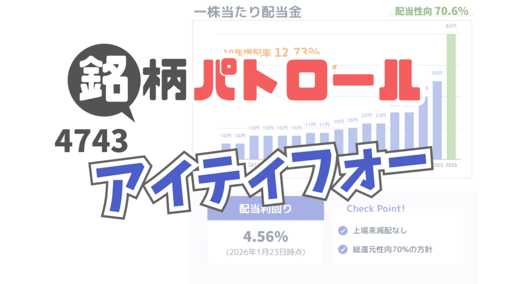上場来減配なし!情報・通信の老舗「アイティフォー(4743)」の紹介。 攻めの成長戦略実行中で、「稼ぐ力」の強い企業! 【概略】 ・配当利回り:4.56% ・ROE目標:かなり高い水準の15%維持 ・自己資本:比率80%超え。キャッシュリッチ企業 ・フロー収益とリカーリング収益のバランス◎ ・先行投資の先行きに期待 使う
