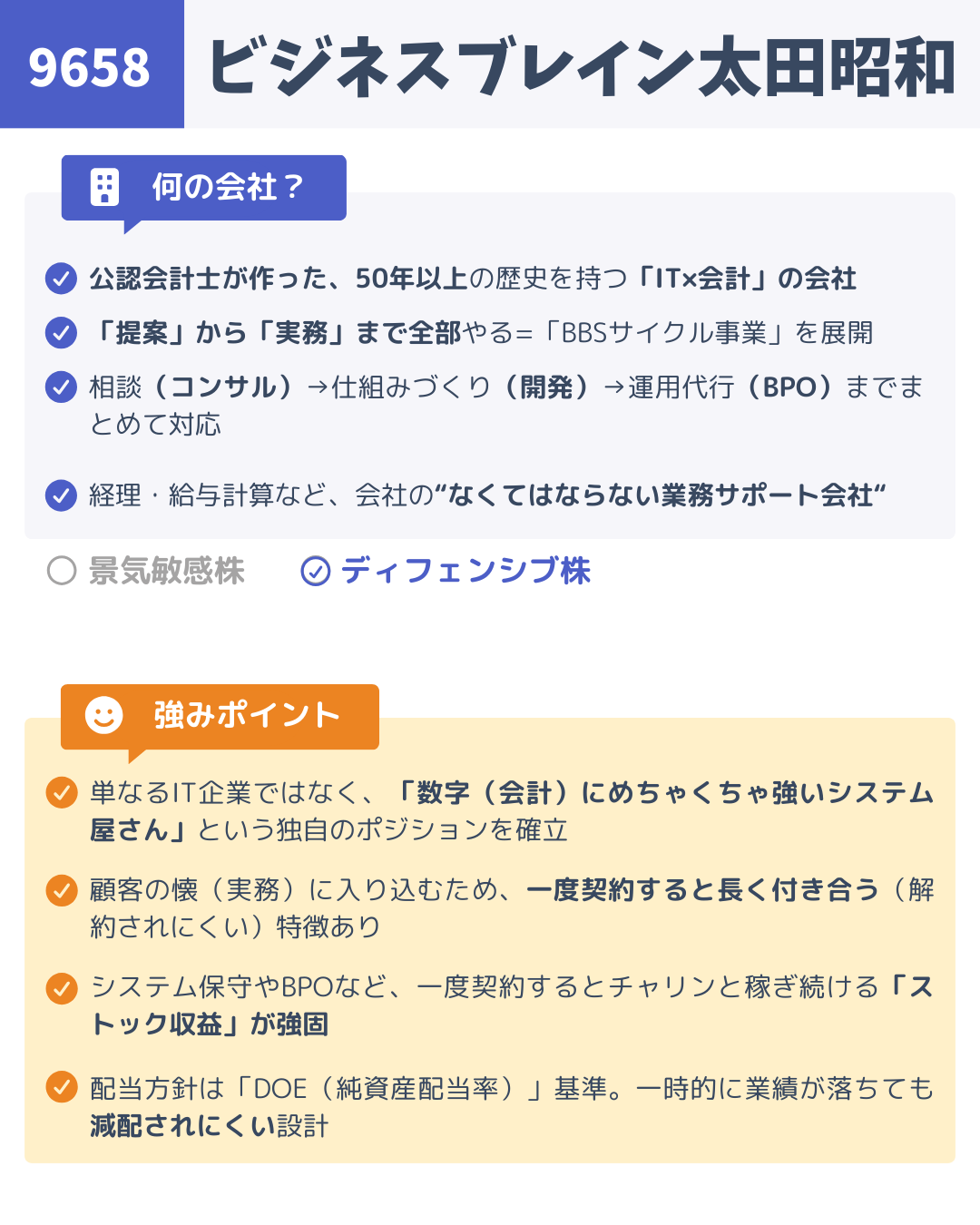 今回紹介する銘柄は、「会計に強いIT会社」のビジネスブレイン太田昭和(9658)📌