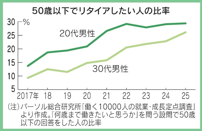 この記事の中で興味深かったのが、「50歳以下でリタイアしたい」と答えた人の割合が、2017年と比べて2倍以上に増えているという点です。