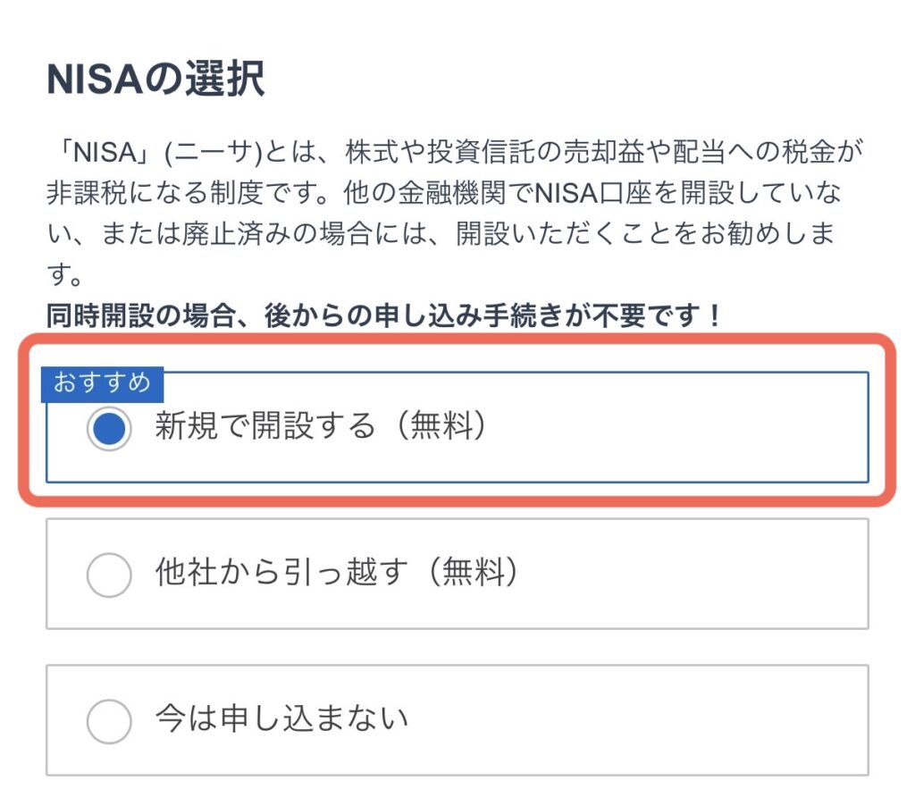 ※NISA口座はひとり1口座しか保有できません。複数の証券会社で同時にNISAを利用することができないことに注意。楽天証券など、他の証券会社ですでにNISA口座を持っている人は、ここでは「申し込まない」を選択するか、「他者から引っ越す」で申し込みしてください。