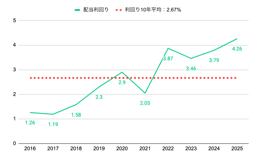 - 増配と高利回りの両立:5期連続で増配を続け、配当はこの5年で約2.4倍に。利回りは4%超と東証平均を大きく上回る
