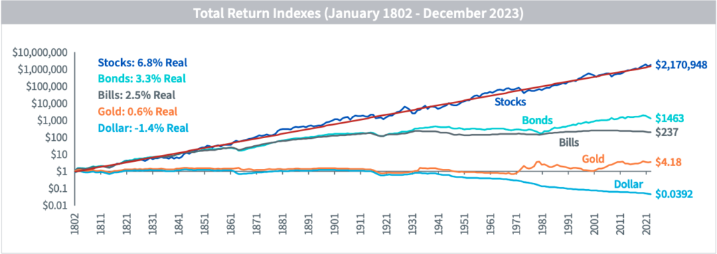 これは約200年間のデータの追跡結果。もし1802年に「1ドル」を持っていたら、200年後にどうなったか?を表したグラフ。